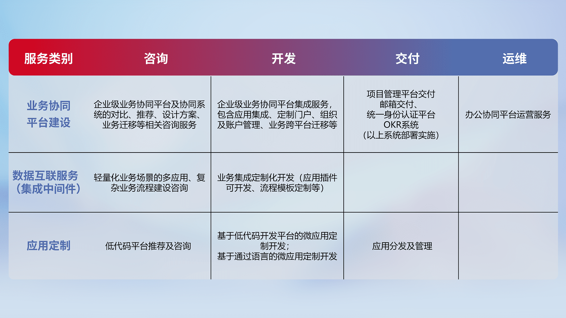 针对钉钉、、企微、、、、IDaas等平台级产品提供产品的规划、、、方案、、、、交付、、、定制化开发等服务,,实现如统一协同办公、、智能客户服务、、混合会议管理、、、智能数据查询、、、等业务场景,,,,实现数字化转型。。。