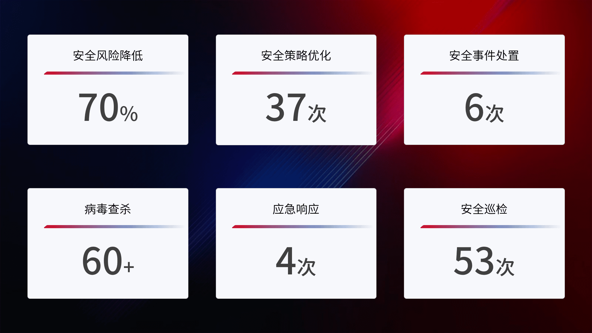 提供全面的安全事件报告体系,,,,包括处置报告、、周报、、季度和年度总结,,结合持续监控,,,,帮助客户深入了解网络安全状况。。