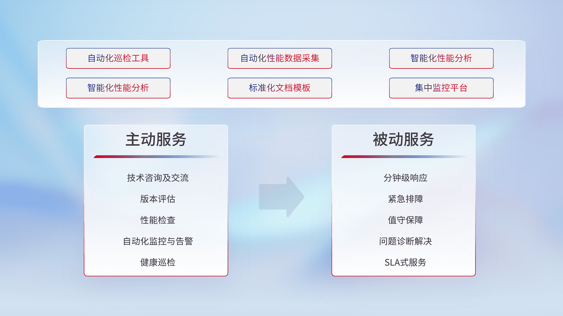 智能化工具和标准化文档,,,,保障服务质量,,提供主动服务(包含技术咨询、、版本评估、、、、性能检查、、、、自动化监控与告警、、、健康巡检)和被动服务包含(分钟级响应、、、紧急排障、、、、值守保障、、问题诊断解决、、、SLA服务)。。。
